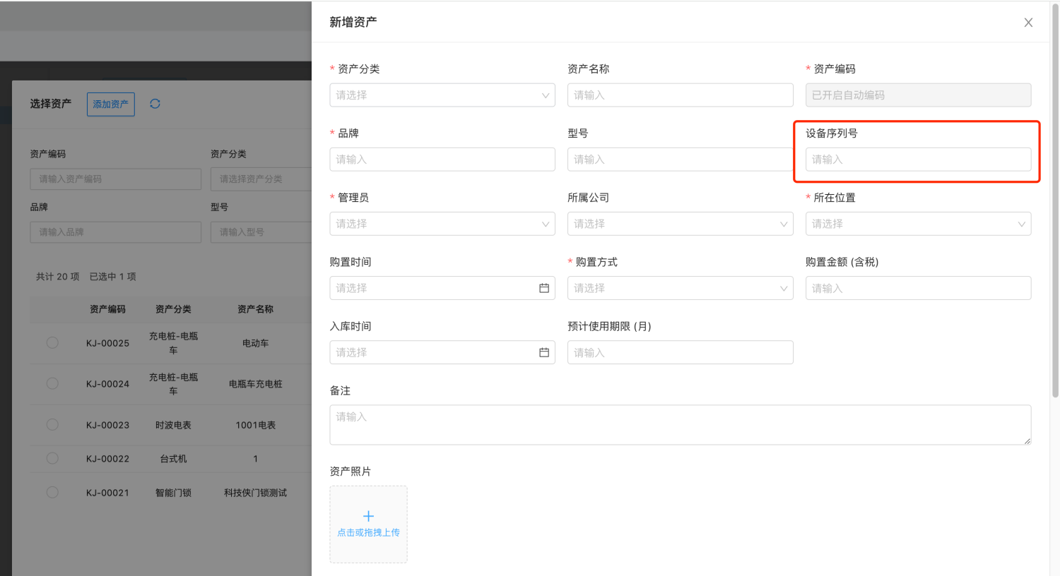 在添加资产的过程中,请注意【设备序列号】需要填写 科技侠APP中的设备ID。