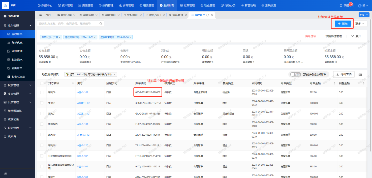 账单基本由创建合同时自动生成出来,例如 租金保证金、租金、物业保证金、物业费 。也可能由业务生成,例如 水电抄表 可以一键生成账单,也会展示在此。