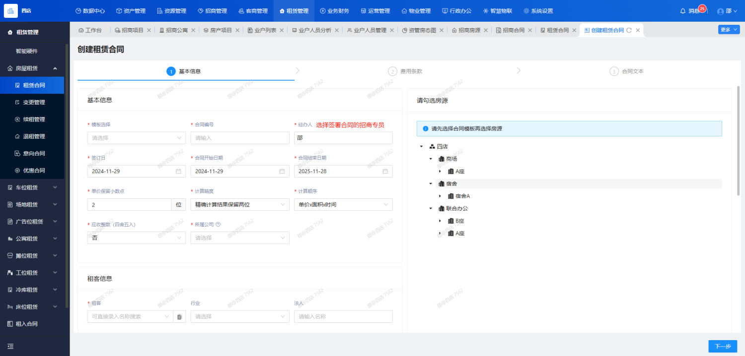 注意:在创建合同时一定要注意创建合同的经办人需选择对应的招商专员,此时在这里绑定合同后招商人员的所属合同才会在【招商合同】中展示。