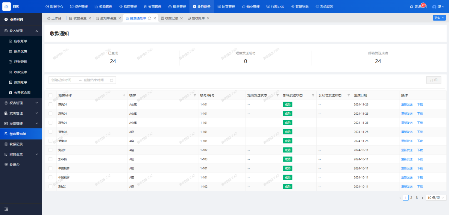 通过【所有账单】发送账单通知后,在【收款通知】会展现对应通知情况。也可针对对应通知情况进行重发或下载。
