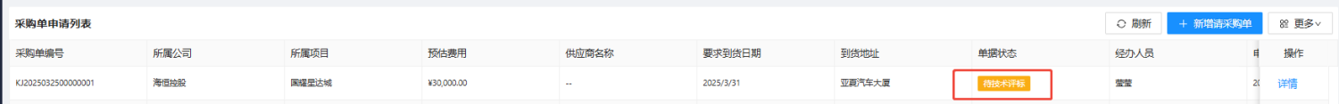 当单据状态呈现【待技术评估】时点击【详情】先【导出评标文件】用于线下相关部门评标,然后在进行【录入评审结果】走剩余流程。