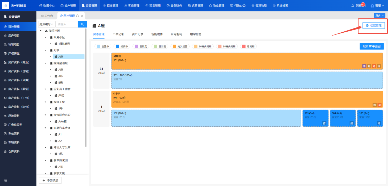 资管房态图:提供了全面的租控概况,可直观了解可招商房源和不同到期时间的房源。