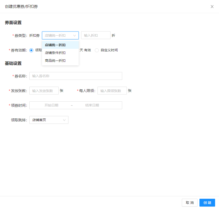 商品直减券,不需要满足金额,直接可以减券面金额,可以设置领取后直接跳转店铺主页还是商品详情页,可以指定是商品使用。