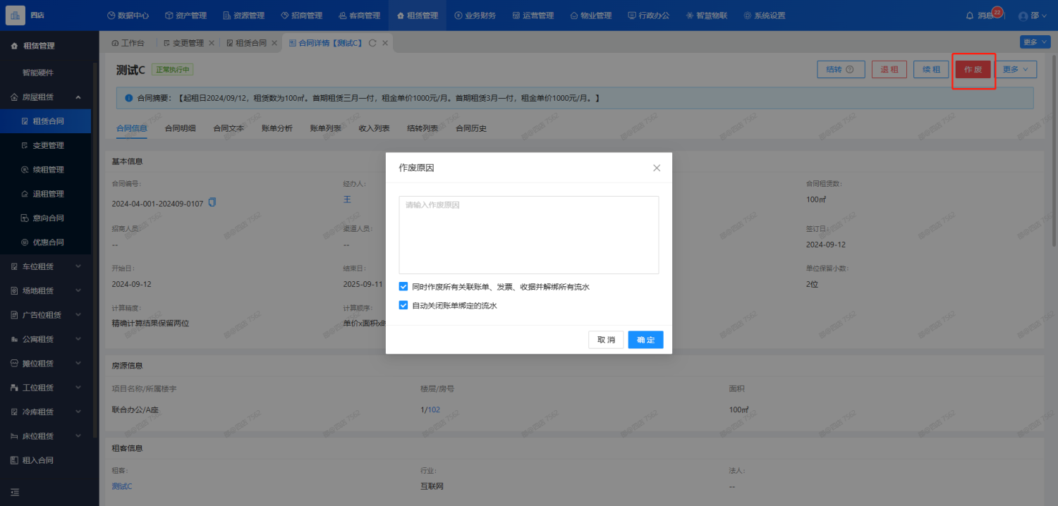 【租赁管理】-【合同列表】选择进入对应需要作废的合同,并点击【作废】按钮,填写作废原因。