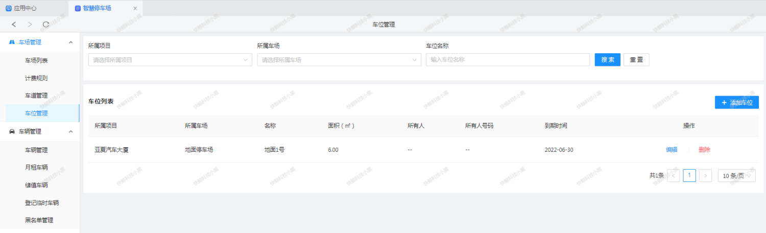 在【资源管理】-【车位管理】中设置每个车位占地面积,及车位所有人信息查看。