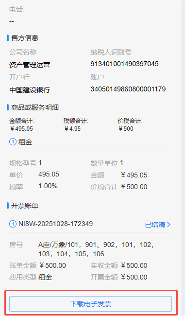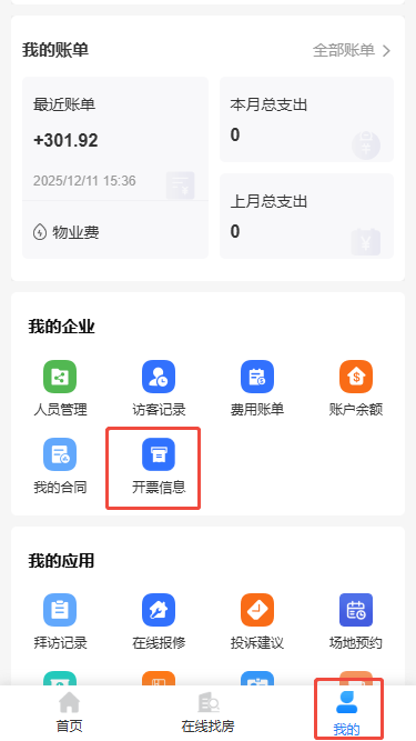 租客可在【我的】-【开票信息】中针对需要开票的账单进行选择后进行开票操作。