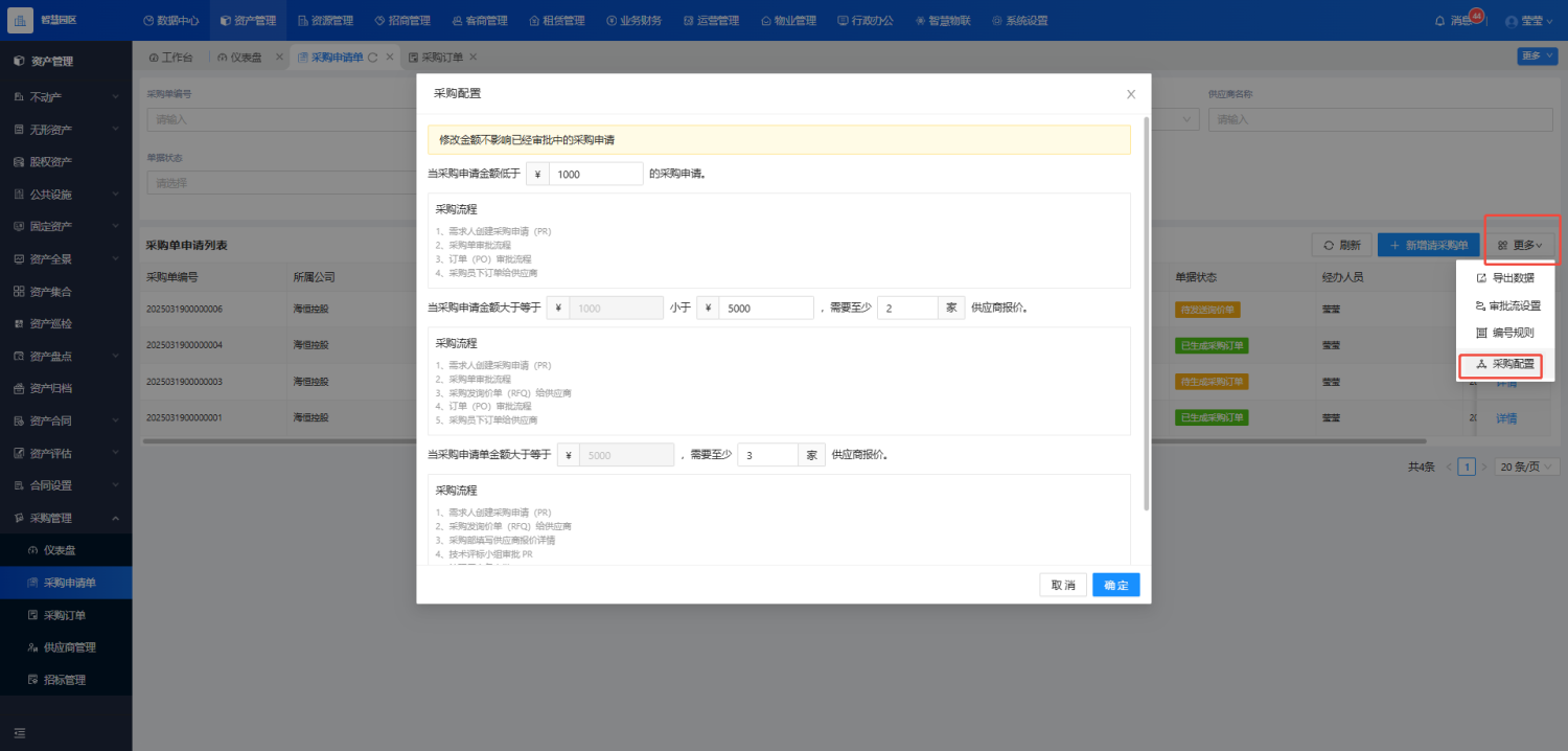 当设置的金额在【更多】-【采购配置】中的第二、三档,则无法直接选择供应商,需要走供应商报价环节。