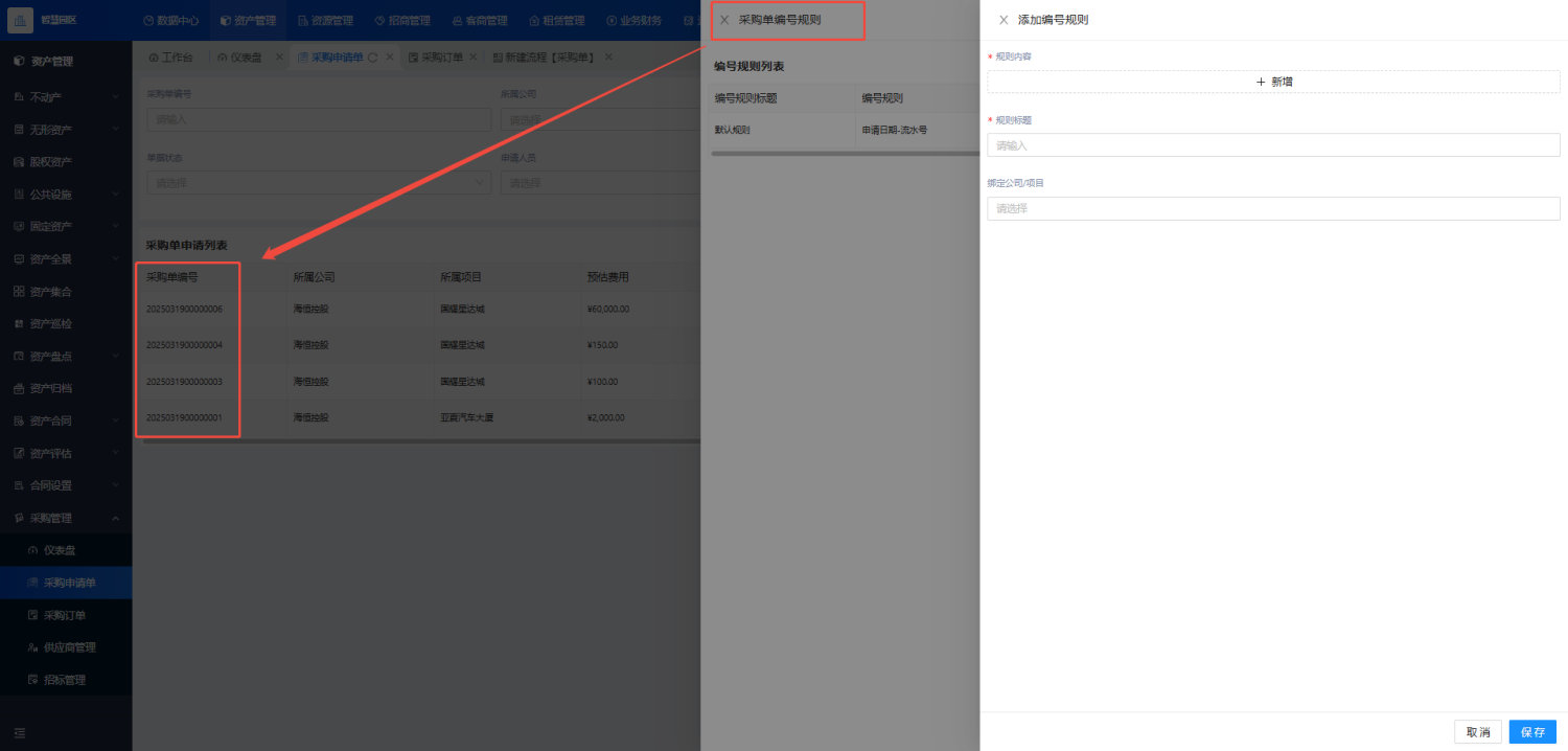 【更多】-【编号规则】自定义设置生成的采购单编号,其内容会在列表中【采购单编号】中根据您设置的内容进行展示。