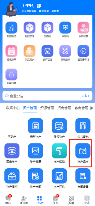 分配任务:设定盘点人员及其盘点的类型。当盘点员打开盘点应用只可看见对应类型下的资产,然后进行资产盘点。