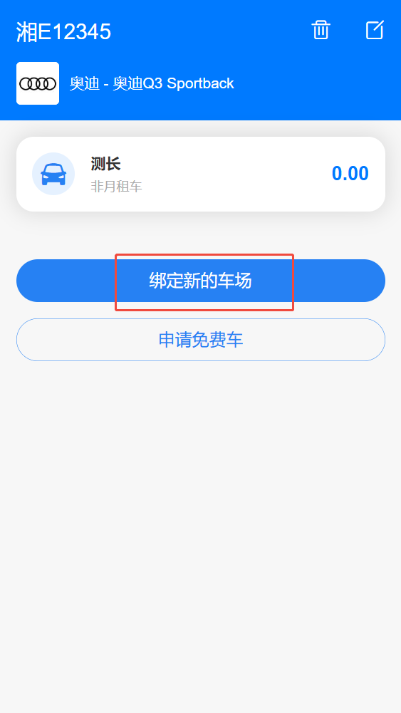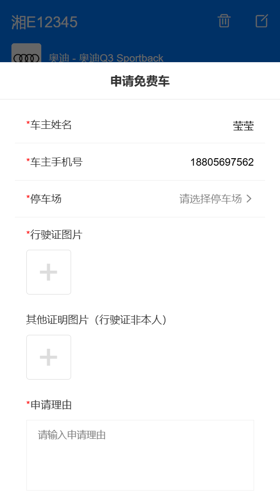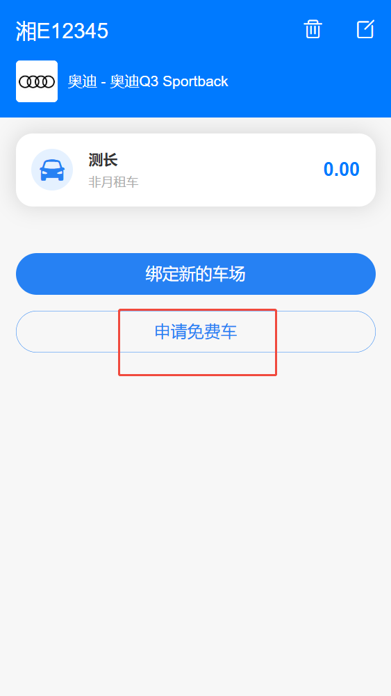 在【我的】-【我的服务】-【我的车辆】点击进入已绑定车辆,点击【申请免费车】进行车辆信息填写,供项目管理员审核。