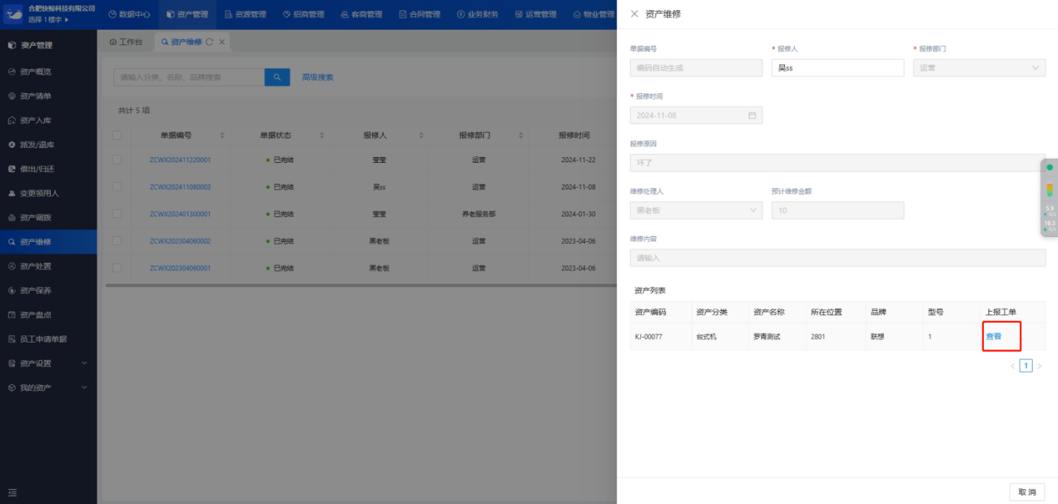 审批通过后状态变为【已完结】。如果存在需要上报维修工单进行处理的,需要点击【单据编号】-【上报工单】-【查看】进行工单创建。