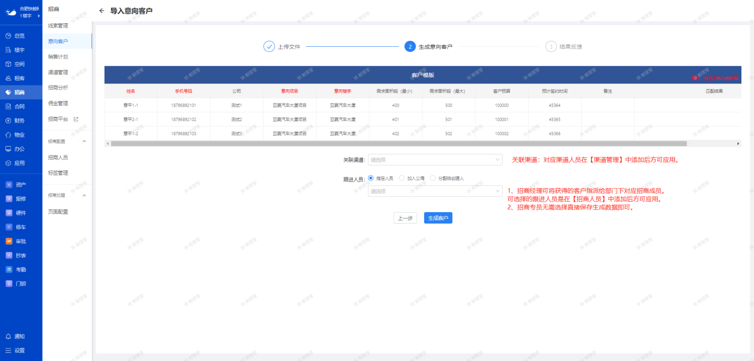 该功能只有在【招商人员】中设置为招商经理的人,才能看到自己以及自己团队成员下的全部客户数据。超级管理员可看到项目下全部客户数据。