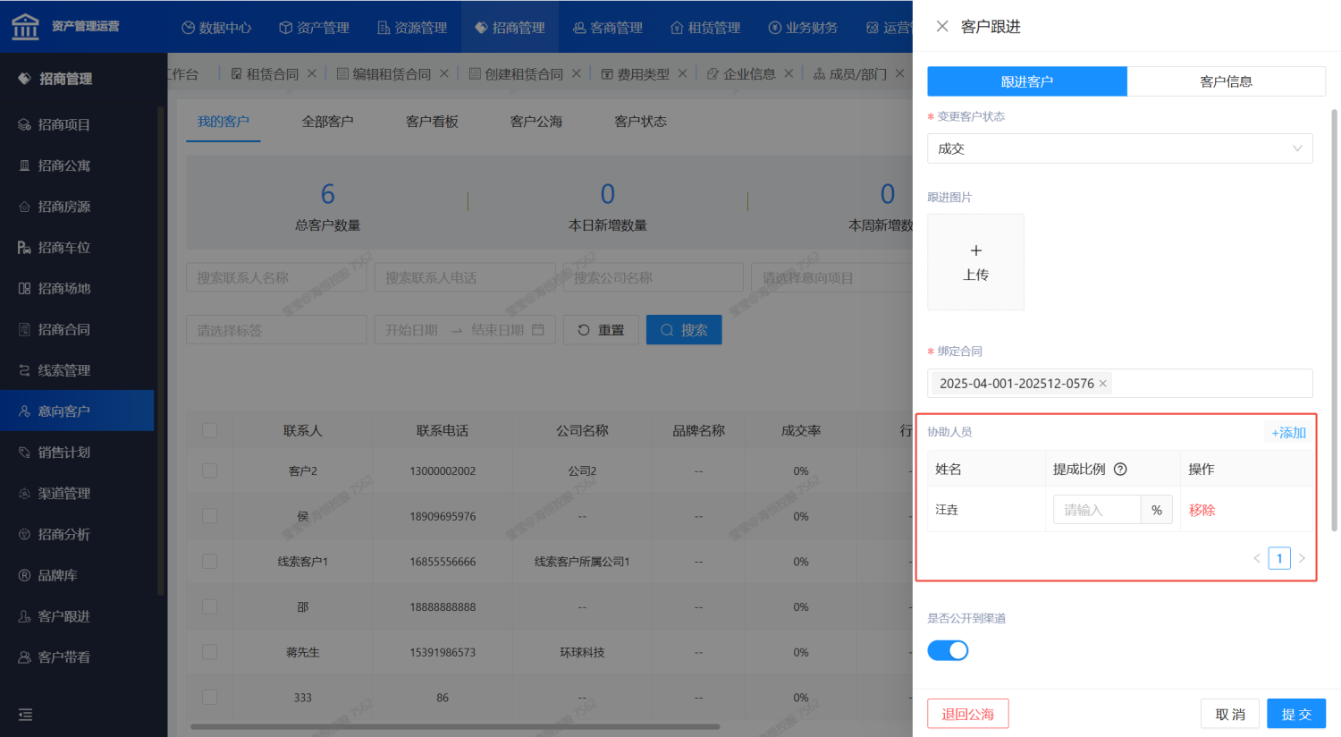 注意:如果开启了佣金规则,那么在创建合同时一定要注意创建合同的经办人需选择对应的招商专员,此时在这里绑定合同后招商人员才能获得对应佣金。
